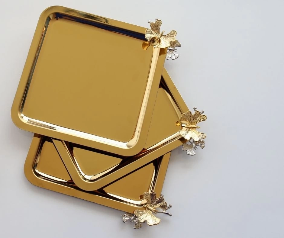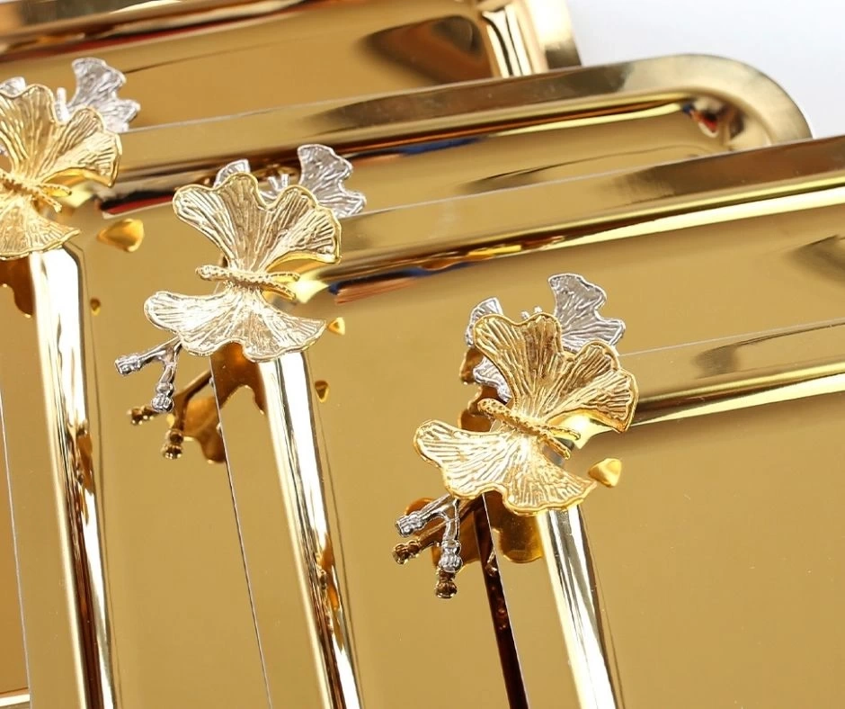 1. Kalite Kelebekli Dövme Desenli Kahve Sunumluk Metal Damat Söz Tepsisi Gold 25x16 cm