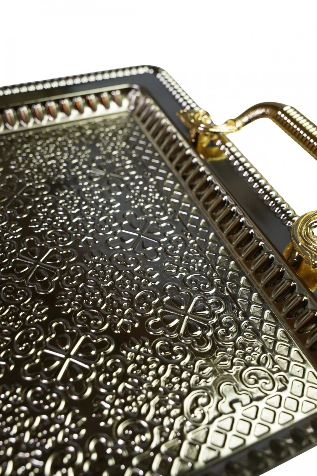 Tek Kişilik Dövme Desenli Kahve Sunumluk Metal Damat Söz Tepsisi GOLD 26 X 16 CM