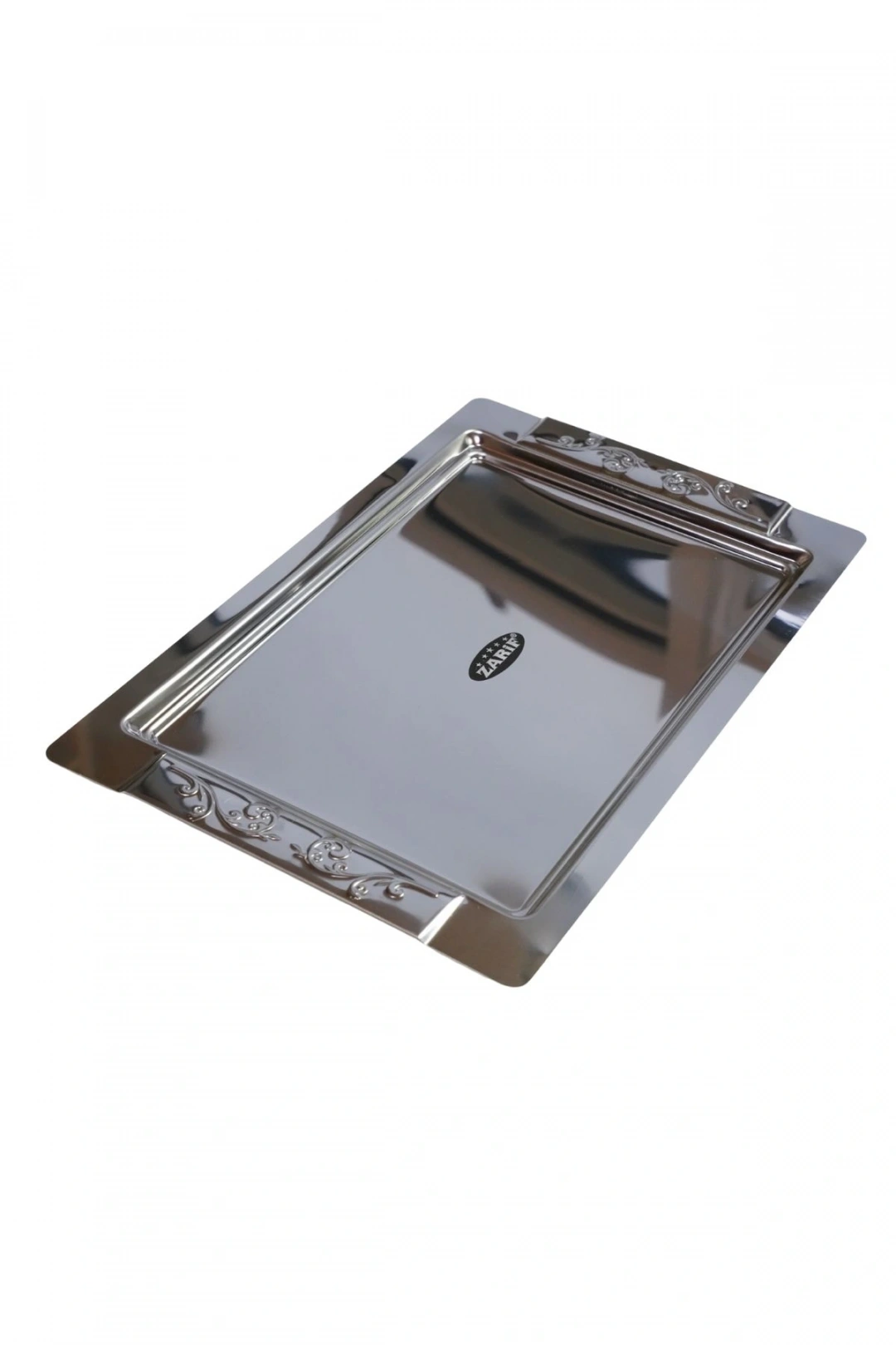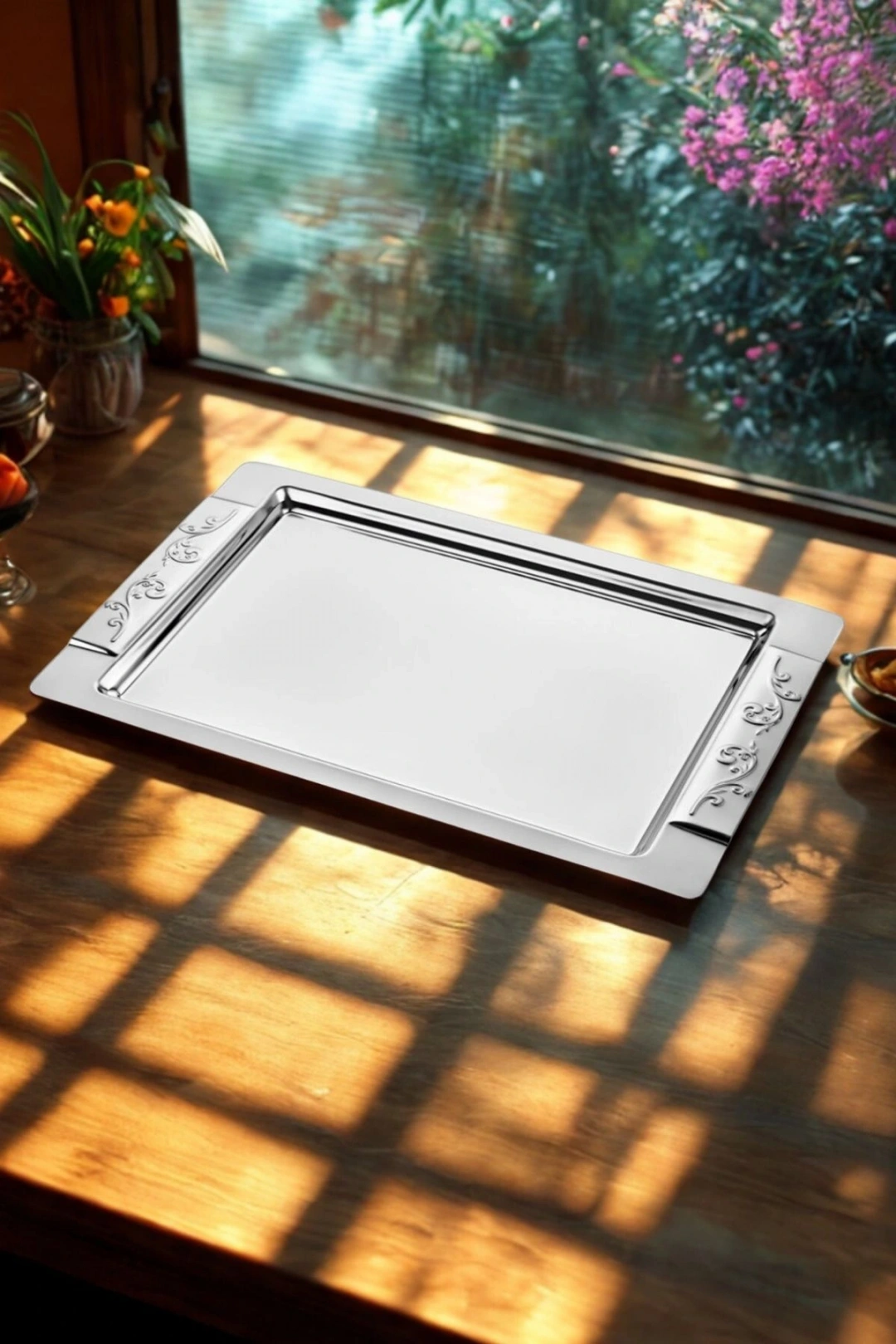 Şık tasarımı ve dayanıklı yapısıyla öne çıkan bu dikdörtgen çelik servis tepsisi, hem günlük kullanım hem de misafir sunumları için mükemmel bir tercihtir. Kenar kısımlarındaki zarif desen detayları ile sofralara estetik bir hava katar. Paslanmaz çelik malzemeden üretilmiş olup uzun ömürlü kullanım sağlar.