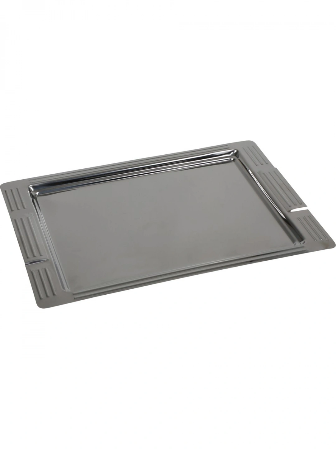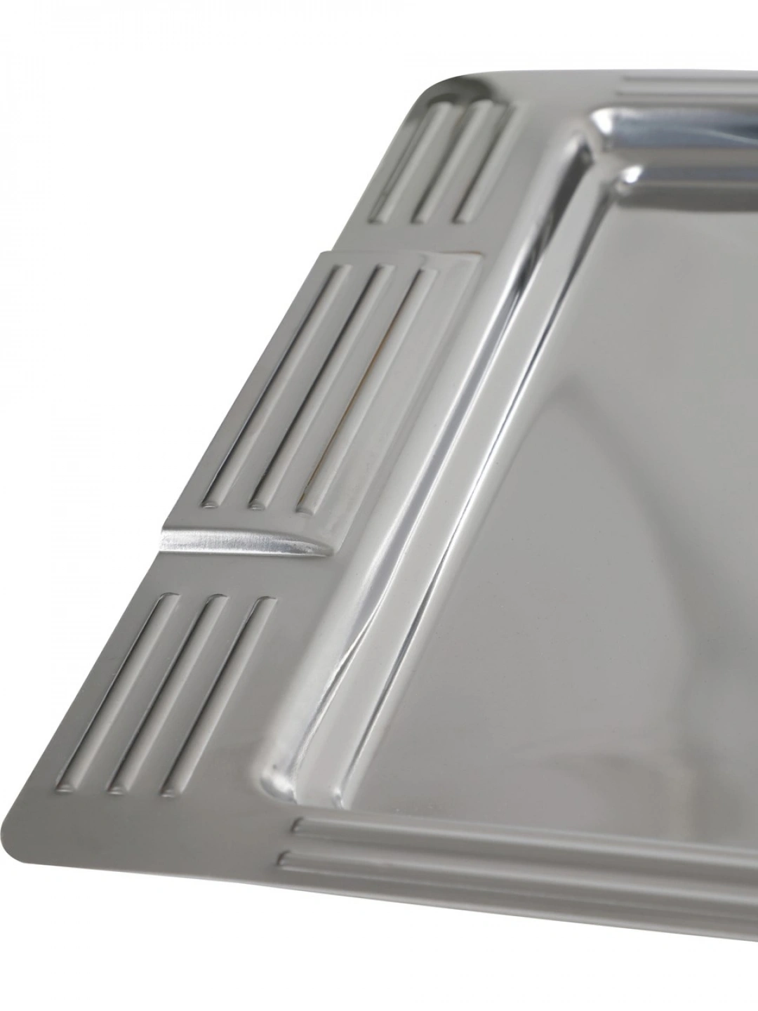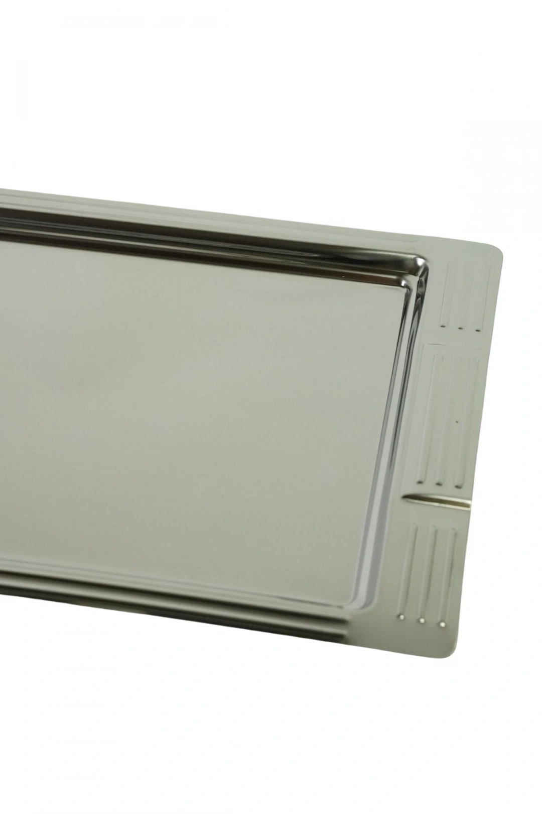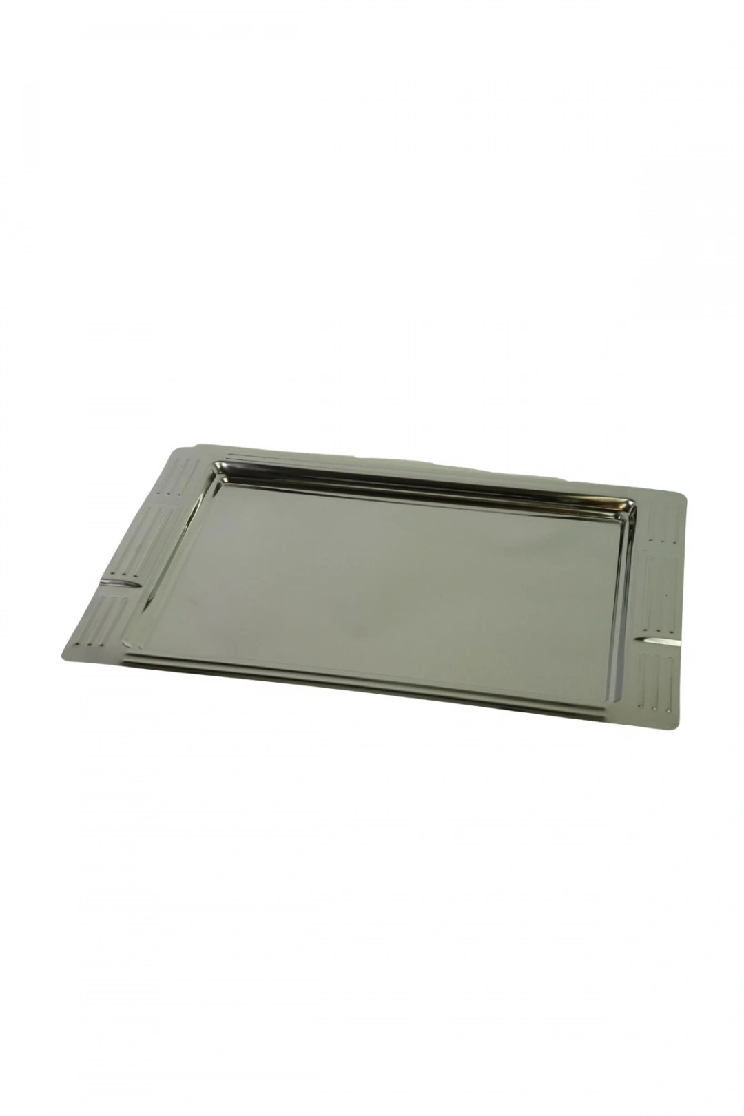 Şık tasarımı ve dayanıklı yapısıyla öne çıkan bu dikdörtgen çelik servis tepsisi, hem günlük kullanım hem de misafir sunumları için mükemmel bir tercihtir. Kenar kısımlarındaki zarif desen detayları ile sofralara estetik bir hava katar. Paslanmaz çelik malzemeden üretilmiş olup uzun ömürlü kullanım sağlar.