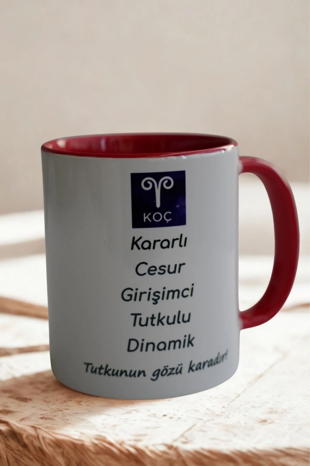 Koç burcunun enerjik, girişimci ve cesur ruhunu yansıtan bu özel porselen kupa, hem modern görünümü hem de burca özel baskısıyla dikkat çeker. Kırmızı iç yüzeyi ve kırmızı kulp tasarımıyla estetik bir duruş sunan kupanın üzerinde Koç burcunun karakteristik özellikleri yer alır: