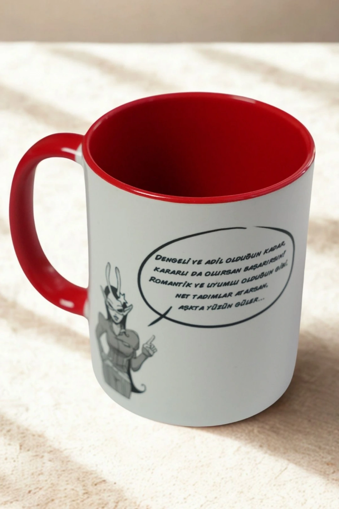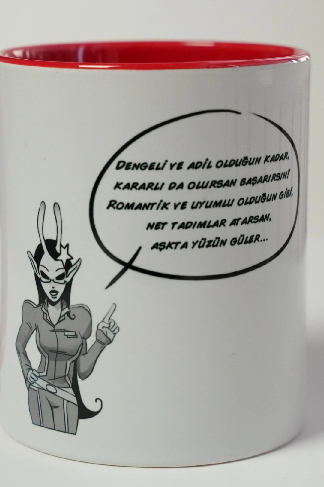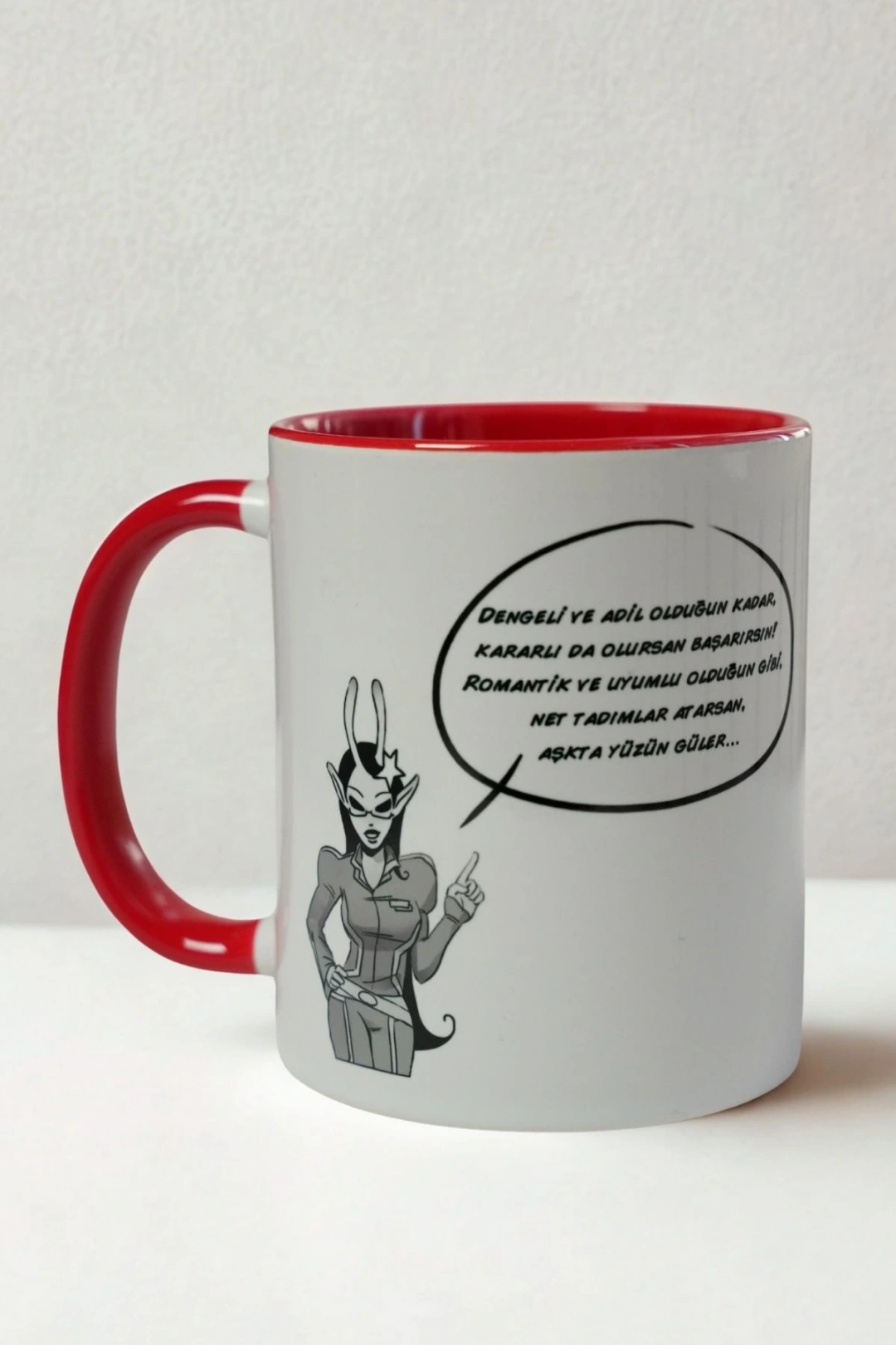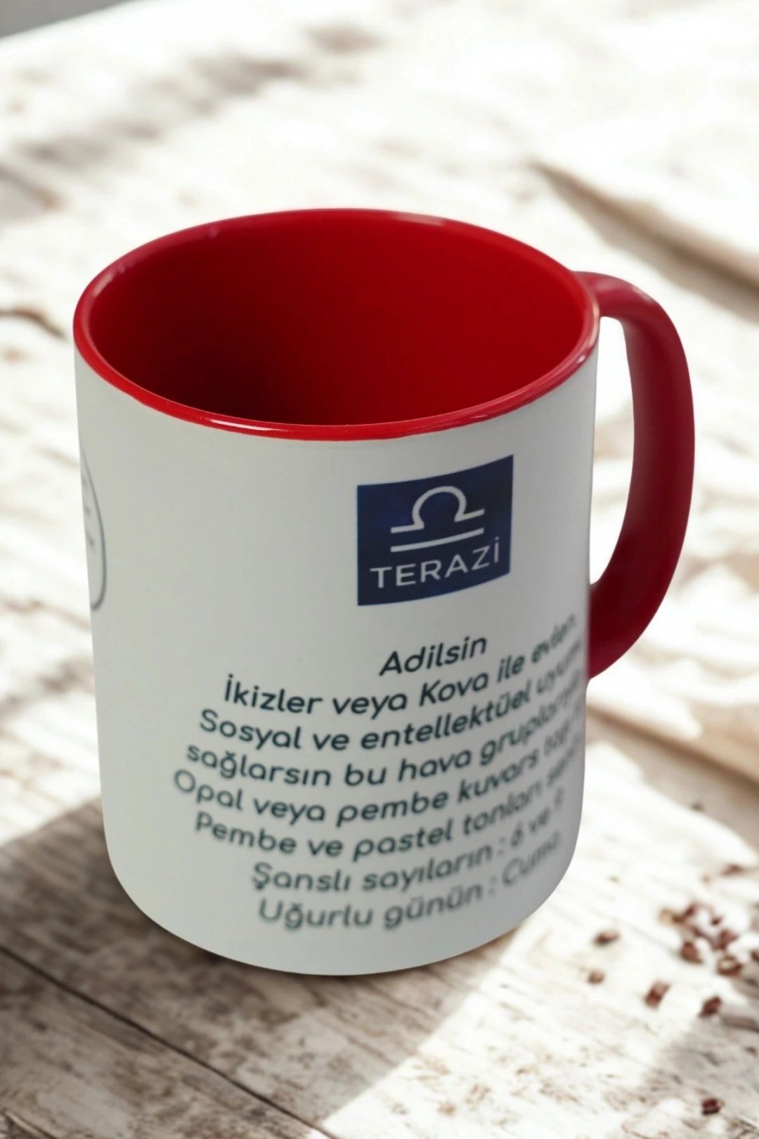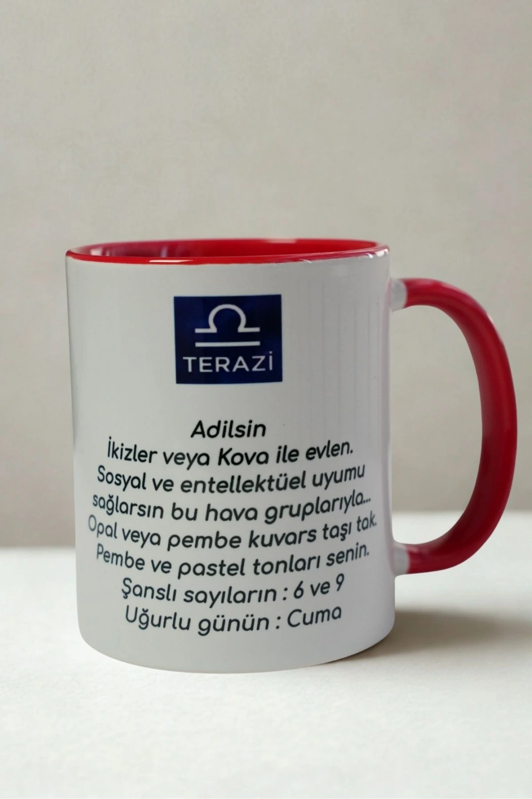 Kupanın dış yüzeyi beyaz, iç kısmı ve kulbu ise kırmızı renktedir. Özenle üretilmiş porselen yapısı sayesinde sıcak ve soğuk içeceklerde güvenle kullanılabilir. Terazi burcu sevdiklerinize özel, zarif bir hediye alternatifi olarak mükemmeldir.