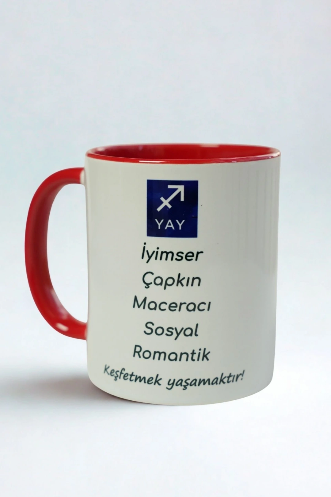 Yay burcunun enerjisini yansıtan bu özel tasarım kupa, hem günlük kullanım hem de hediye amaçlı tercih edilen şık ve anlamlı bir üründür. İç ve kulp kısmındaki kırmızı detaylar modern bir görünüm sunarken, kupa üzerinde Yay burcunun karakter özellikleri yer alır: İyimser, Çapkın, Maceracı, Sosyal, Romantik…