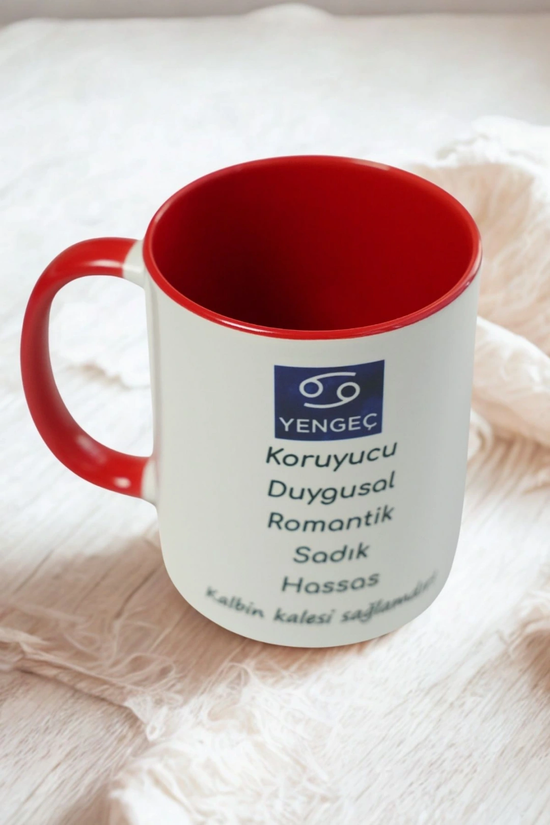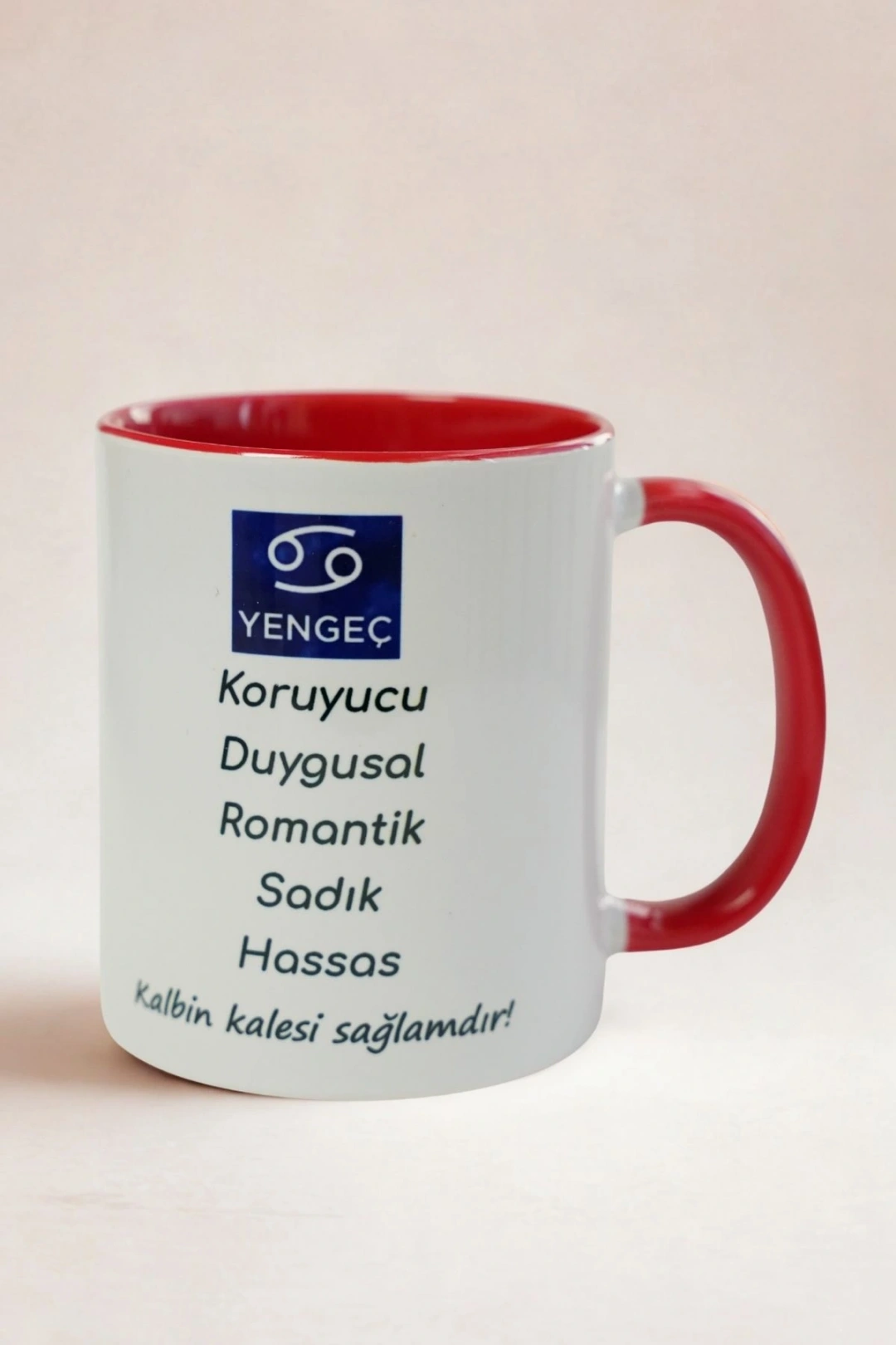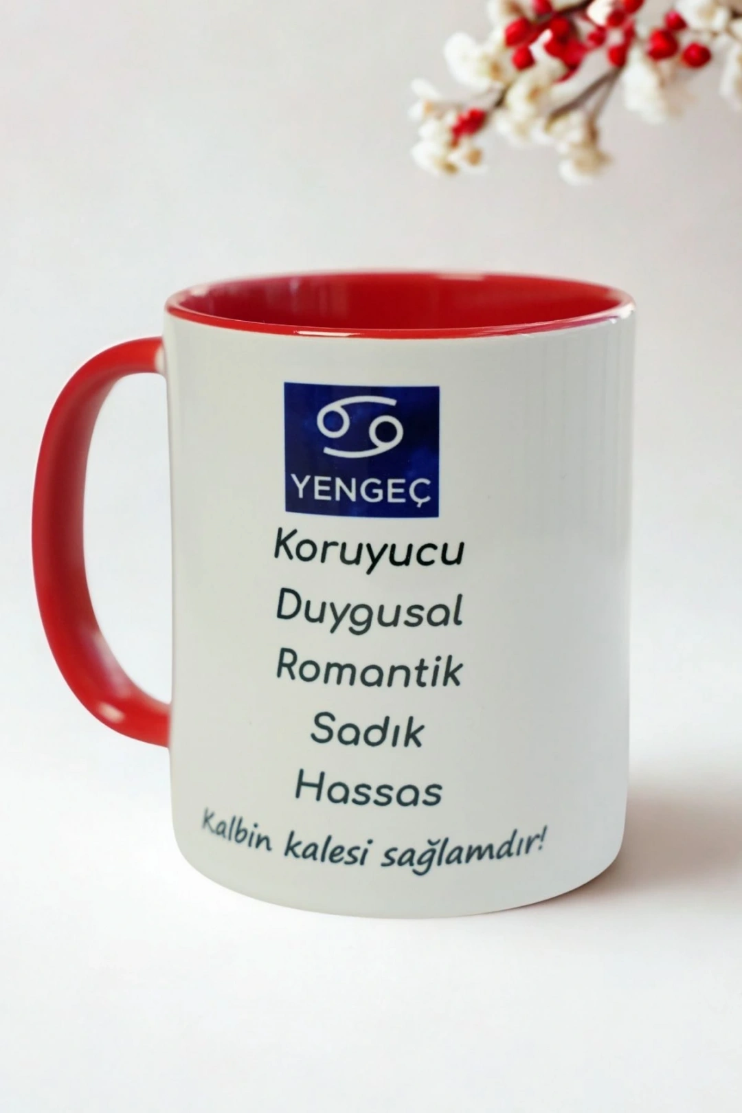 Duygusal, romantik ve koruyucu Yengeç burçlarına özel olarak tasarlanan Yengeç Burcu Porselen Kupa, zarif detaylarıyla dikkat çeker. Beyaz dış yüzey ve kırmızı iç kulp tasarımıyla şık bir görünüm sunar. Üzerinde Yengeç burcunun sembolü, karakter özellikleri “Koruyucu, Duygusal, Romantik, Sadık, Hassas” ve anlamlı “Kalbin kalesi sağlamdır!” yazısı yer alır.